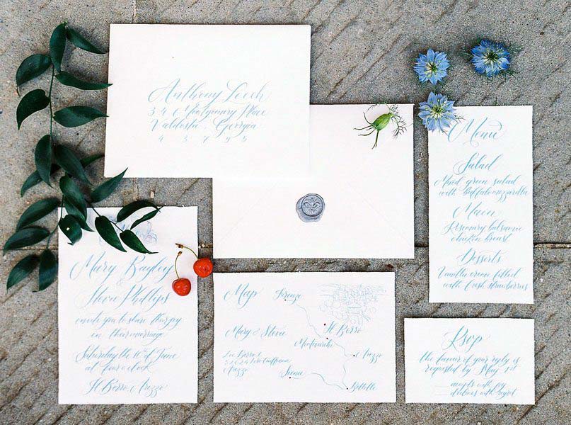 Many young girls dream of their wedding day since their childhood, however I don’t think you could ever dream of a wedding location this spectacular. The Tuscan Wedding had an extremely particular vision for this lovely shoot, with help from Darya Kamalowa; an excellent photographer who lives in Milan, Italy, they accomplished their goal. We loved her vision for this shoot and it is always a pleasure working with her. This shoot is full of colors, creativity, and inspiration for a dream wedding in the hills of Tuscany. These photos take place at IL Borro located in the heart of Tuscany, however not far from the city of Florence. This villa has it all and will take your breath away the moment you enter. From the stationary to the food to the table setting every little detail has a consistent color theme. The Tuscan Wedding wanted to create a unique feel, including cold and warm colors in their shoot. They used blues, grays, and greens to create a cool tone, sprinkling a pop of cherry red to create a hot tone. In all areas of this shoot you can find this exclusive color theme.